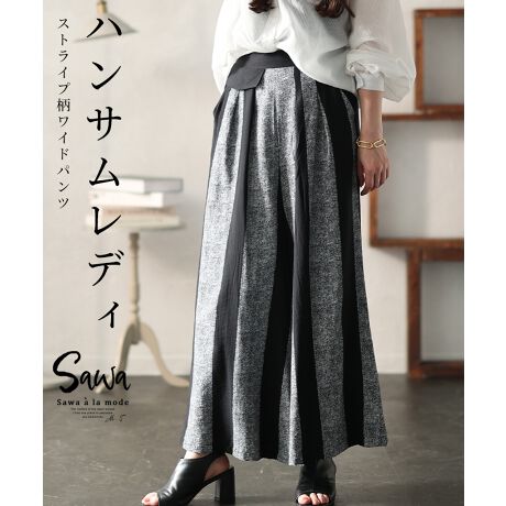 廃りのないストライプ柄がカジュアル感を引き立て、縦ラインを強調するから、穿くだけでスタイルアップが叶います。スカートの様なフレアなシルエットで、女性らしく体型カバーに。ウエスト部分に配されたフラップが遊び心を加え、モード感を加速させます。両サイドにポケット付きで、何かと重宝します。前後でデザインの変化も楽しめる一枚です。