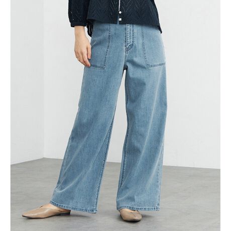 裾への広がりが緩やかで、床に向かってストンと落ちるラインの、脚長効果抜群のベイカーワイドパンツ。カジュアルな仕様でありながらも、生地の絶妙な表情と、身生地に近い同色系の糸使いによって、大人っぽさと女性らしさを演出した仕上がりに。