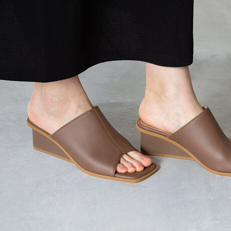 甲深ミュールは、履くだけでトレンドを取り入れられる便利なデザイン。幅広スクエアトゥと中底より細めにデザインされたウェッジヒールにピースが相まって、モード感あるテイストに。
