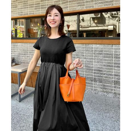 人気インフルエンサー・水野佐彩さんとのコラボアイテム。カットソー素材と少しハリ感のある素材を組み合わせたドッキングワンピース。上品に広がるフレアシルエットで女性らしい印象にこだわりのウエストの切り替えラインで細見えとスタイルアップが叶います。