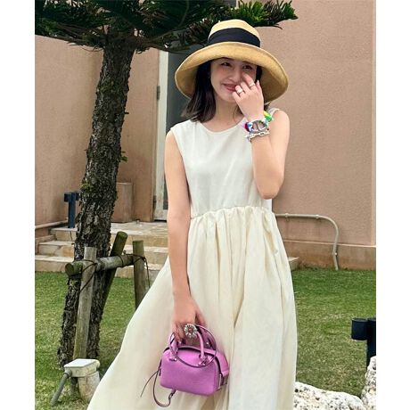 人気インフルエンサー・水野佐彩さんとのコラボアイテム。カットソー素材と少しハリ感のある素材を組み合わせたドッキングワンピース。上品に広がるフレアシルエットで女性らしい印象にこだわりのウエストの切り替えラインで細見えとスタイルアップが叶います。