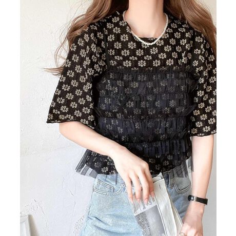【mily bilet】セットアイテムで可愛らしく!花柄ジャガードチュールビスチェ付き半袖ブラウス