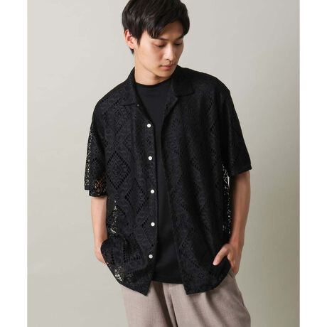 透け感のあるラッセルダイヤ素材を使用した五分袖オープンカラ―シャツ◆