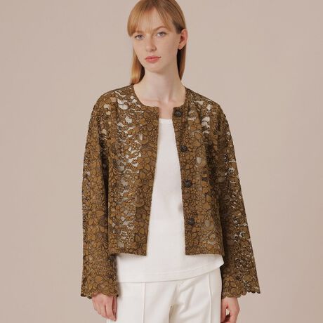 ワンピースやカットソーとパンツの上にサラッと羽織っていただけるラッセルレースジャケットです。裾に向けてやや広がるシルエットが軽やかでリラックスした雰囲気です。裏地なしです。