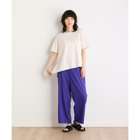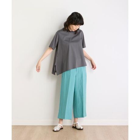 裾の左右非対称なアシンメトリーデザインがポイントのカットソー。ネックラインや、裾の分量感、袖丈、着丈などに拘り、ニュアンスのあるTブラウスに仕上げました。どんなボトムと合わせても着映え効果のある一着です。シルキーな光沢とハリ感が特徴のポンチ素材を使用。適度なハリにより、ボディラインを拾わない肌離れの良いストレスフリーな着心地です。洗濯後の型崩れなどが生じにくい、イージーケア性も併せ持っています。 ・水洗い可