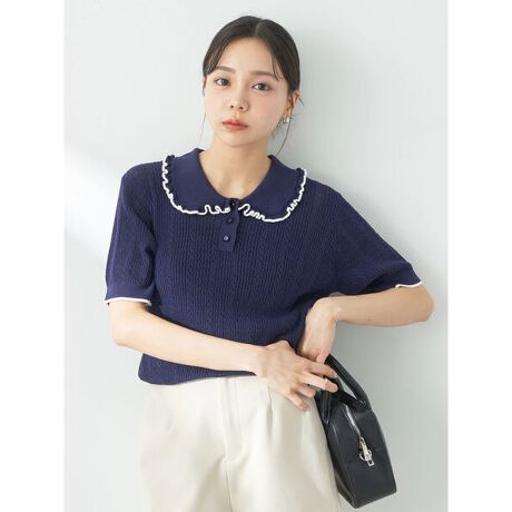 襟に施されたフリルがフェミニンなムードを演出するポロシャツ。