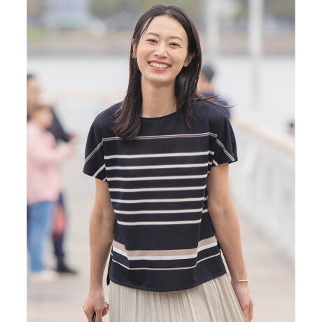 オリジナルなボーダーで、夏に着映えるカットソー。袖はタックを取った、大人な雰囲気のフレンチスリーブです。裾にスリットを入れて前後差をつけた、パンツとスカートのどちらにも合わせやすいデザインも魅力。コーディネートの華やかなアクセントになるアイテムで、デイリーに活躍します。カラーは、落ち着いた雰囲気のブラック(#105)、肌なじみの良いベージュ(#133)の2色展開です。