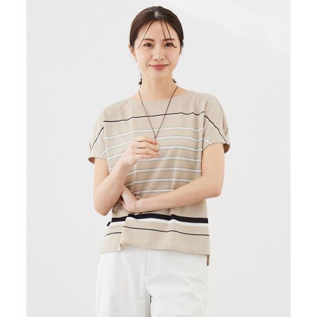 オリジナルなボーダーで、夏に着映えるカットソー。袖はタックを取った、大人な雰囲気のフレンチスリーブです。裾にスリットを入れて前後差をつけた、パンツとスカートのどちらにも合わせやすいデザインも魅力。コーディネートの華やかなアクセントになるアイテムで、デイリーに活躍します。カラーは、落ち着いた雰囲気のブラック(#105)、肌なじみの良いベージュ(#133)の2色展開です。