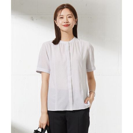 爽やかなストライプ柄の、前開き仕様のバンドカラーブラウス