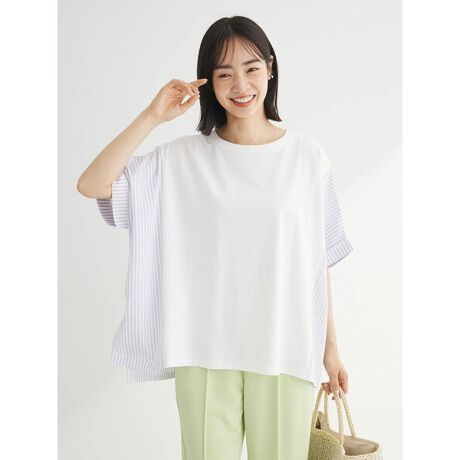 [型番:6A46L1C1200]脇の異素材切り替えがアクセントになったドッキングデザインのプルオーバー。ゆとりのあるシルエットが気になるボディラインを優しくカバー。華奢な印象に見せてくれる嬉しい効果も期待することができます。ストライプ柄でスタイリングも爽やかに演出してくれるアイテムです。透け感[やや有り]ネイビー無し 裏地[無し] 伸縮性[やや有り] 光沢感[無し] 生地の厚さ[薄手] 付属品[無し] ポケット[無し]