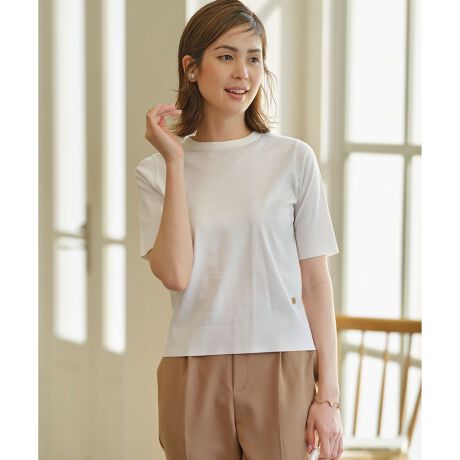 ■デザイン上質な素材を活かしたベーシックなシルエットは、カットソー素材だからこそ叶うアイテム。コンパクトなサイズ感、緩やかなウエストシェイプ、きちんと見えする首回りの形状や品のある5分袖など、細部のデザインまでこだわりました。ニットの品の良さとカットソーの着心地の良さを兼ね備えた究極のベーシックアイテムです。ウエストアウトで着た時にアクセントになる左脇のメタルパーツや、内衿側にある配色ラインもポイント。