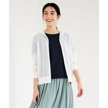 上品な透け感が特徴のニットシアーパーカー。身幅は大きすぎず、程良いサイジングに仕立てて軽やかでキチンとした印象に。フーディーやコードエンドなどのパーカー特有のディティールと、シアーの素材感が相まってカジュアルながらも女性らしい、洗練された雰囲気を演出します。夏の冷房対策はもちろんのこと、季節の変わり目まで活躍する万能アイテムです。カラーは、清潔感のあるホワイト(#001)、柔らかく女性らしいベージュ(#033)、爽やかなアクセントになるシーブルー(#071)、どんなカラーにも合わせやすいネイビー(#075)の4色で展開します。