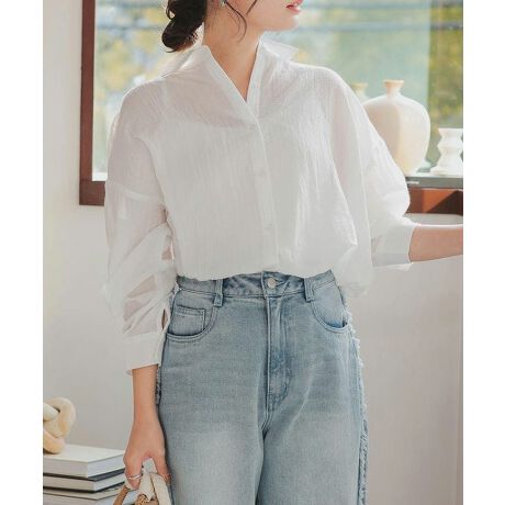 ふんわりとした素材感とシアーな透け感が魅力のガーゼシャツを、低身長さんが着こなしやすいサイズ感に調整。