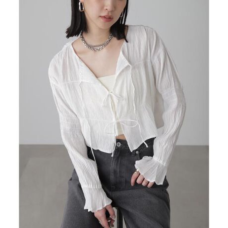 シャーリングでギャザーを入れた可愛らしい短丈カーディガン。楊柳のような凹凸素材は、落ち感とふんわりとボリュームのあるバランスの良い仕上がり。やや透けるシアー素材のため、さらっと軽く羽織れるのも嬉しいポイント。前開きはリボンデザインで、紐を垂らしたままでも結んでも着こなせます。ほの甘デザインには敢えてデニムパンツやカーゴパンツを合わせるのがオススメ。ワンピースの上にボレロのように羽織れば、こなれ感が出るスタイリングになります。※モデルの着用画像の場合、光の当たり具合により、実際の色味と異なって見えることがございます。色味は、商品単体の画像をご参照ください。