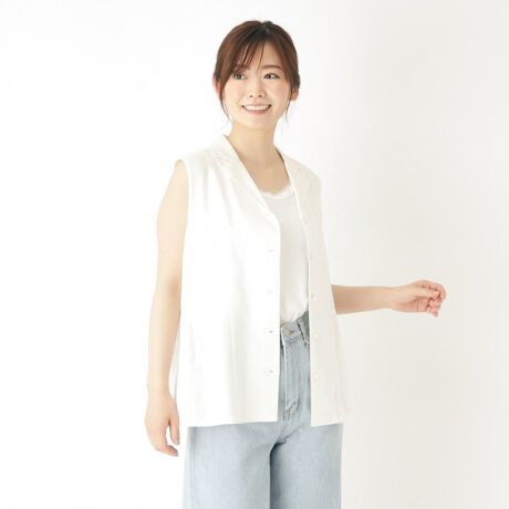 身頃のダーツや開襟がヴィンテージ感のあるシルエットで、ノースリーブにすることで開襟でも涼しげに見えるデザインです。