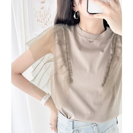 チュールギャザーが女性らしいトップス。