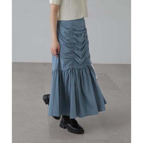 フロントのドロストデザインで表情をプラスしたトレンド感のあるマーメイドスカート。レーヨンナイロン素材でさらっとした触り心地です。風合いのある表面感でカジュアルライクな素材感なので、こなれた雰囲気のスタイリングにも使いやすい1枚。後ろウエストゴム仕様なので着心地もよく、ONOFF問わずお使いいただけます。プリントTシャツやタンクはもちろん、シアートップスやビスチェなど、幅広いアイテムとのコーディネートが楽しめます。今季らしくカジュアルダウンさせた着こなしがおススメ。※モデルの着用画像の場合、光の当たり具合により、実際の色味と異なって見えることがございます。色味は、商品単体の画像をご参照ください。