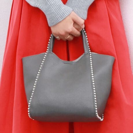 ボディーからハンドルにかけてのボールチェーンがアクセントになったトートバッグ。