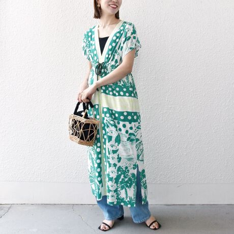 南国のスカーフ風パネルプリントを使用したIラインワンピース。