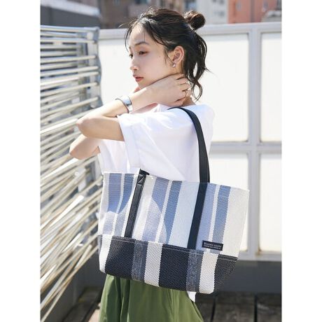 きれい目カジュアルに合う、ざっくりとしたストライプ生地の大きめトートバッグです。