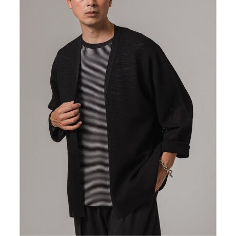 ヴィスコース/ポリエステルの清涼感のあるドライな肌触りが特徴の糸を使用した、メッシュ編みのボタンレスカーディガン。
