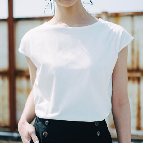 [型番:kw00752]透けないフレンチスリーブTシャツ前身頃は2重仕立てで下着が透けにくい優秀アイテム! 肌に優しい綿100%のカットソー生地。 吸汗性と通気性に優れているので夏の暑い時期も快適◎1枚で着こなしの主役になる大人のTシャツです。