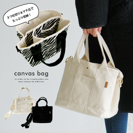 [型番:o00390]3つ仕切り&マチ広でたっぷり収納できる! キャンバス生地ミニトートバッグ コンパクトながら広めのマチでたくさん入るキャンバストート。内側は3つ仕切りになっていて、オープンポケット付きの収納力。ペットボトルを立てられたり、B5ノートも収納できます。