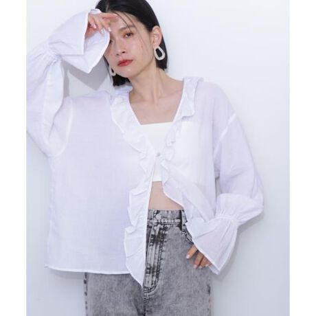 [型番:1664110603]カーディガン感覚で羽織っていただけるブラウスは、フロントのラッフルディテールが華やかに着映えるデザイン。手首まわりをキュッと締めるフレアスリーブもフェミニンなアクセントに。インにはキャミソールやタンクトップなどを合わせれば、適度な抜け感のあるスタイルを演出できます。デニムパンツやマニッシュなパンツなど、シンプルカジュアルスタイリングがお勧め。