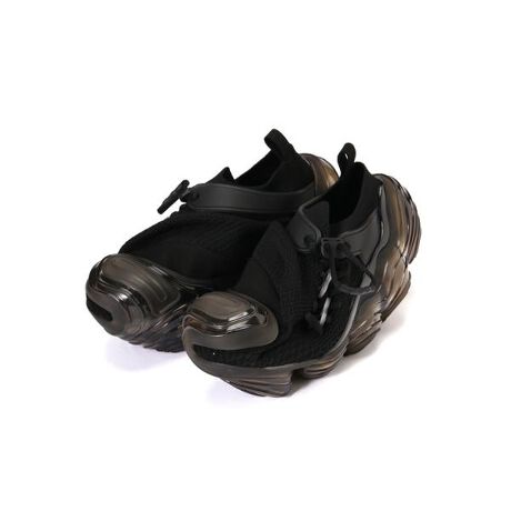 ねじまげられたフットウェアアウトソールとアッパーがねじまげられ、2つが溶け合うようにしてアウトソールがアッパーの上の領域まで侵食しています。アッパーも同様に複雑にねじられ、本来真ん中にあるべきパーツが左右へとずらされています。アッパーはニットアッパーを採用しシューレースは結ぶのではなくコードストッパーで絞るタイプ。ヒールの高さはおよそ7cm。※このアイテムはブランドの中でもファッション性の強いアイテムです。 舗装された道路以外の歩行は推奨されませんので、あらかじめご了承ください。