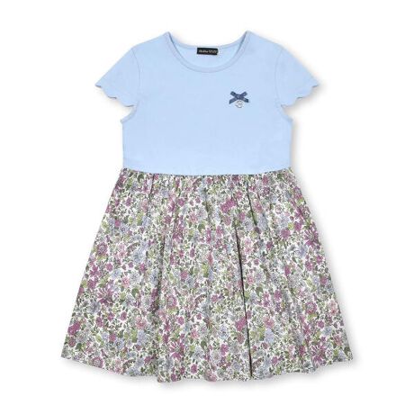 可愛らしい印象の花柄ローン生地と天竺を切り替えたドッキングワンピース。