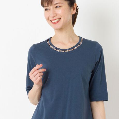 襟元の上品な透け感が美しく、ネックレスいらずの華やかさがあります。