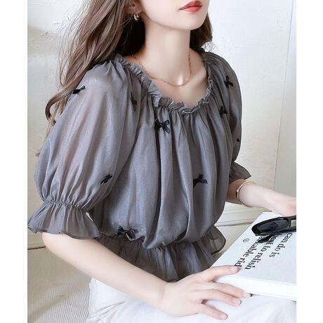 フロントにちりばめられたリボンデザインが目を惹くブラウス。