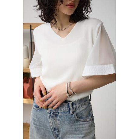 2024 Spring&Summer item ■商品(デザイン)ポイント: 華やかなラッフルスリーブが引き立つVネックプルオーバーです。 袖は上品なシアー感のあるオーガンジーとサテンを、身頃は清涼感のあるニットを合わせた異素材ドッキングトップス。 女性らしさが引き立つ1枚です。 程よいコンパクトさで、ボトムスを選ばないサイズ感。 ■商品ディティール: Vネックラインはデコルテをすっきりキレイに見せてくれます。 ラッフルスリーブは気になる二の腕まわりを上手にカバーしてくれます。 ■スタイリング :ボリュームのあるフレアスカートやマニッシュな雰囲気のパンツなどでデイリー使いはもちろん、オフィスカジュアルなど幅広いシーンで着用いただけます。 ■素 材:手洗い可。袖布帛切り替え。 ■透け感:なし ■光沢感:なし ■伸縮性:あり ■裏 地:なし