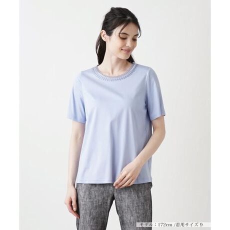 ネックラインを飾るチュールやラメの刺繍の装飾がアクセントになった半袖カットソー。エレガントなディテールが際立ち、日常のスタイリングに華やかさを添えてくれるアイテムです。ほんのり光沢のあるスムースなコットン生地ならではの美しい風合いが感じられ、快適な着心地を実感できます。一枚で着こなしてもスタイリッシュに決まりますが、ジャケットやカーディガンのインナーとしても最適。バックネックの涙あきはループボタンにより開閉が可能です。------------------------------------夏あり色によりありなしやや薄手ウォッシャブル(手洗い可)なし-------------------------------------※商品の色味は、撮影場所や光のあたり具合、お客様のお使いの機器により色味が違って見える場合がございます。予めご了承ください。 ■□Leilian WHITE LABEL(ホワイトレーベル)・・・実力派デザイナーとの協業で、ベーシックな商品によりトレンド性を取り入れたブランドです。□■※定価(税込)は、2024年6月28日のセール開始前の店舗における販売価格です。