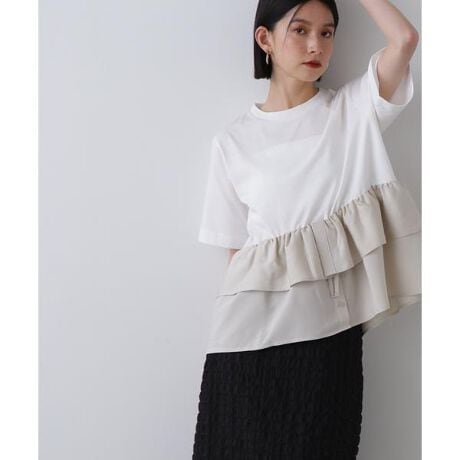 [型番:1664260601]Tシャツ×シャツブラウス風ペプラムシルエットを組み合わせた、旬のディテールが引き立つ一枚。ウエストラインに付けている紐の調節で、きゅっとペプラムを際立たせたり、ゆるシルエットにも変化できるデザイン。異素材コンビながらも、コーディネートに馴じんでくれる色合いと風合いです。デニムパンツ、Iラインスカート、マニッシュなパンツスタイルまで着まわせます。