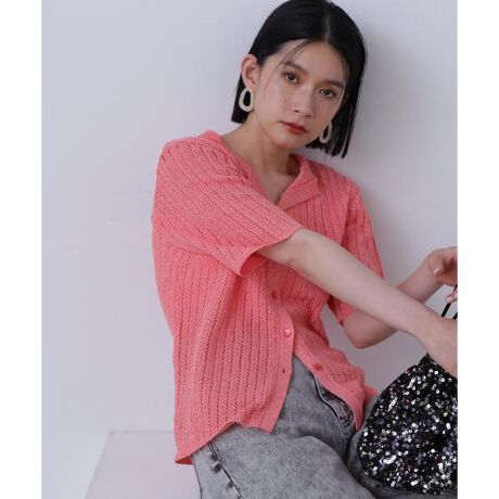 [型番:1664270651]涼しげな柄編みに開襟を組み合わせた、夏に映えるニットです。ナチュラルな雰囲気の編地をいかし、前ボタンを開けてカーディガン感覚でも着られるデザイン。フロントボタンは一番下まで付けていないので、アウトスタイルでスリット風に見せて着られます。デニムパンツ、マニッシュなパンツ、フェミニンなマキシスカートも合わせやすく、リラクシーな装いを楽しめます。