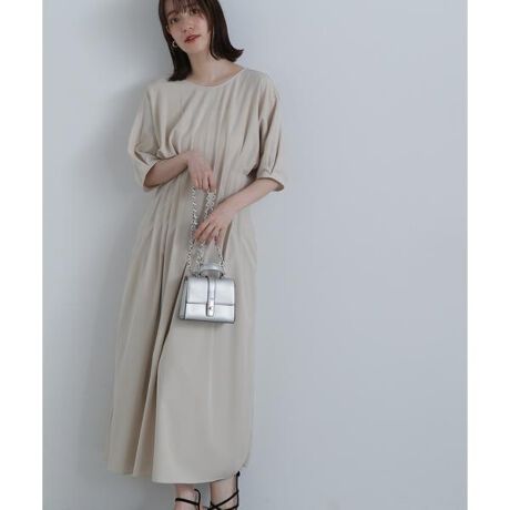 ウエストにタックを入れることで、女性らしい立体感のあるシルエットを叶えるワンピースです。襟ぐり前は詰まりすぎないクルーネックで、後ろはVラインで涼しげな抜け感を演出。袖は二の腕をカバーしつつ、肘が隠れるくらいの袖丈です。シンプルなデザインながらもタックディテールが引き立ち、一枚でコーディネートが決まります。