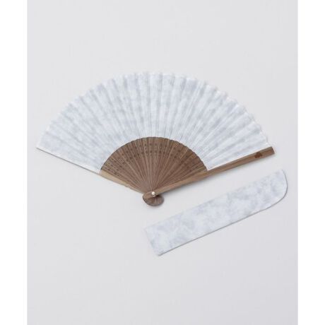 [型番:7XCP2201-2024]生地にむら染めの技術を使った竹扇子。扇面はしっかりとした厚手の綿生地で、ひとつひとつ模様の表情が異なります。シンプルな扇形は年齢性別問わずお使いいただけます。持ち運びに便利な専用袋付き。
