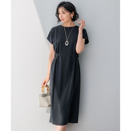暑い時期にもさっと着られてきれい見えが叶う半袖ワンピース。落ち感のある素材を使用することで、下に流れるようなシルエットを演出します。両サイドのベルトディテールをウエスト位置やや高めに施すことで、縦長のすっきりとした着こなしが叶います。気になる二の腕も程よくカバーしてくれる袖丈で、夏に1枚で着ても着心地よく安心できる、オンオフ活躍してくれるデザインです。同素材のジレをさっと合わせるスタイルもおすすめです。カラーは、上品な雰囲気が漂うダークブラウン系(#035)、清楚な女性らしさを演出するダークネイビー(#075)、程よい甘さと品の良さを感じるテラコッタピンク系(#014)の3色展開です。ダークブラウン系(#035)とダークネイビー系(#075)は黒に近い落ち着いた色合いです。
