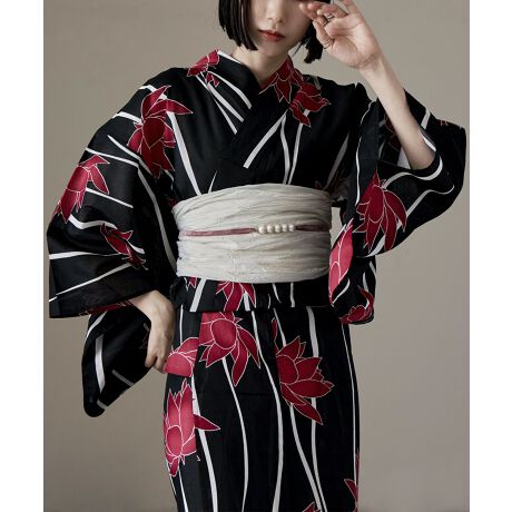 縞と百合の柄を購入。 思ったより少し薄い生地でした。化繊なのですぐ乾くのはいいです。兵児帯は幼い感じがしたので、手持ちの黒の作り帯を合わせたらとてもいい感じでした。シックで気に入りました。