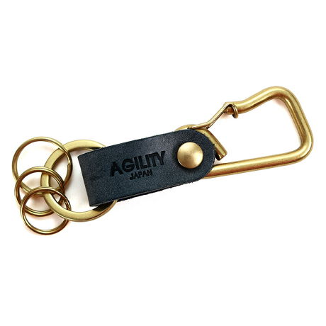 着脱に便利なカラビナ型の金具をメインに、ポイントに革をあしらったキーホルダーです。片手でも簡単に着脱ができるカラビナ型の金具を使用。バッグの金属部分やパンツのベルトループに取り付けてお使いいただけます。ネジを通す革の穴部分には穴の広がりを抑えるためにハトメを入れています。先端の25mmのキーリングには20mmのキーリングが1つと16mmのキーリングが2つついています。20mmのリングは車のスマートキー(リモコンキー)などを装着し、2つある16mmのリングはそれぞれノーマルなカギの装着を想定しました。25mmの元リングに鍵をつけることもできます。真鍮製のカラビナは使い込むうちにアンティークゴールドへ変化していきます。
