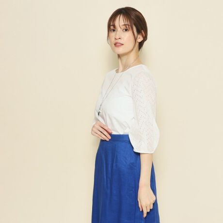 袖部分はコットン100%のジオメトリックなレース刺繍素材を使用しています。