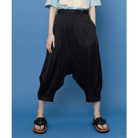 ウエストをベルトとタックで仕上げ、しっかり見えを作りながら、股上を深くドレープを効かせたサルエルパンツは大人見えのする上品な雰囲気に仕上がっています。