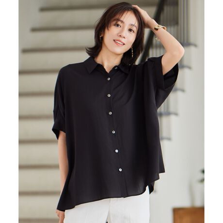 ご好評のリヨセルポプリンに、コーディネート広がる新色を追加ゆったりとしたシルエットで1枚で着やすいブラウス■デザインたっぷりとした身幅がポイントのブラウスです。ドロップショルダーのオーバーサイズシャツとは異なる、たっぷりとした身頃にそのままカフスをつけたようなデザインにすることで、美しいドレープと抜け感を感じられる1着に仕上げました。ボディラインを拾いにくく、体にまとわり付かないしなやかな素材なので、真夏でも涼しく快適に着て頂けます。気になるヒップ周りをカバーできる長さで、シンプルなテーパードパンツやタイトシルエットのスカートと合わせた、メリハリのあるコーディネートがおすすめです。■素材しなやかな風合いと程よい光沢感、美しいドレープ性が特徴の素材です。さらりとしたタッチで、接触冷感、UVケア、抗菌防臭の機能付きです。※オフ(002)カラーとブラック(005)カラーとサックスストライプ(173)カラーは生産時期により素材が再生繊維(リヨセル)か再生繊維(セルロース)のどちらかのお届けとなります。■同素材アイテムワンピース(OPWRGM0509)フリルブラウス(BLWRLM0516)