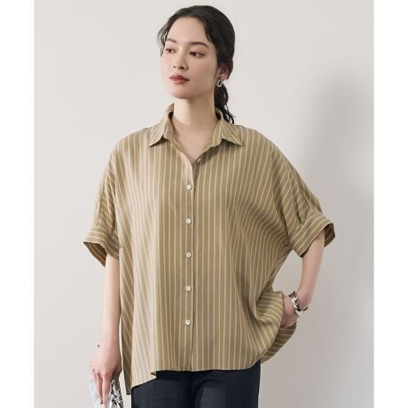 ご好評のリヨセルポプリンに、コーディネート広がる新色を追加ゆったりとしたシルエットで1枚で着やすいブラウス■デザインたっぷりとした身幅がポイントのブラウスです。ドロップショルダーのオーバーサイズシャツとは異なる、たっぷりとした身頃にそのままカフスをつけたようなデザインにすることで、美しいドレープと抜け感を感じられる1着に仕上げました。ボディラインを拾いにくく、体にまとわり付かないしなやかな素材なので、真夏でも涼しく快適に着て頂けます。気になるヒップ周りをカバーできる長さで、シンプルなテーパードパンツやタイトシルエットのスカートと合わせた、メリハリのあるコーディネートがおすすめです。■素材しなやかな風合いと程よい光沢感、美しいドレープ性が特徴の素材です。さらりとしたタッチで、接触冷感、UVケア、抗菌防臭の機能付きです。※オフ(002)カラーとブラック(005)カラーとサックスストライプ(173)カラーは生産時期により素材が再生繊維(リヨセル)か再生繊維(セルロース)のどちらかのお届けとなります。■同素材アイテムワンピース(OPWMGM0509)フリルブラウス(BLWMLM0516)