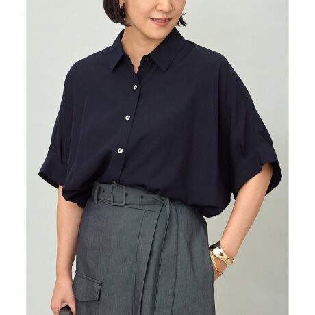 ゆったりとしたシルエットで1枚で着やすいブラウス■デザインたっぷりとした身幅がポイントのブラウスです。ドロップショルダーのオーバーサイズシャツとは異なる、たっぷりとした身頃にそのままカフスをつけたようなデザインにすることで、美しいドレープと抜け感を感じられる1着に仕上げました。ボディラインを拾いにくく、体にまとわり付かないしなやかな素材なので、真夏でも涼しく快適に着て頂けます。気になるヒップ周りをカバーできる長さで、シンプルなテーパードパンツやタイトシルエットのスカートと合わせた、メリハリのあるコーディネートがおすすめです。■素材しなやかな風合いと程よい光沢感、美しいドレープ性が特徴の素材です。さらりとしたタッチで、接触冷感、UVケア、抗菌防臭の機能付きです。※オフ(002)カラーとブラック(005)カラーとサックスストライプ(173)カラーは生産時期により素材が再生繊維(リヨセル)か再生繊維(セルロース)のどちらかのお届けとなります。