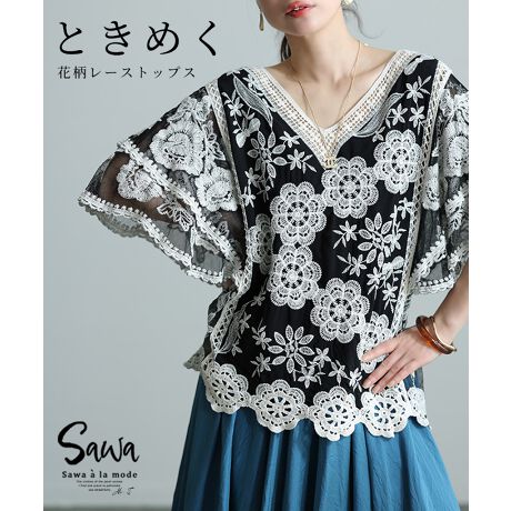 様々な花模様の刺繍がたっぷりとデザインされたガーリッシュなトップスは、フレアスリーブや軽やかさ感じるシアーな生地、レースなど女性らしさを詰め込んだ一枚。Vネックの首元がお顔周りをすっきりとさせ、首長効果に。ネックラインの格子状レースや、スリーブ、両サイドの透け感にほんのり色っぽさを感じます。ティアード状のふんわりと広がるフレアスリーブが、気になる二の腕を可憐にカバーし、シンプルなボトムスと相性抜群。上品にキマるトップスです。