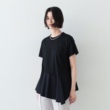 スムースジャージと布帛の異素材コンビネーションが目を惹くペプラムトップス。