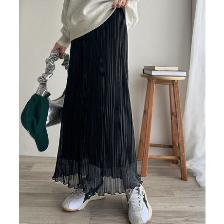 光沢感のあるシャイニーシアー素材と、ランダムプリーツが魅力的な着映えスカート。
