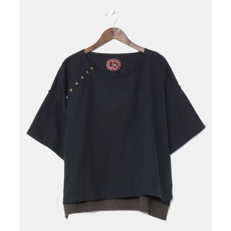 風合いの良い麻混素材で夏にぴったりのビッグシルエットレディーストップス。少し後ろが長めになったハイローヘムのシルエットや、バックスタイルの首元に入った刺しゅう、フロントに斜めに入ったボタンなど、シンプルの中にもこだわりをふんだんに詰め込んだ一枚。袖を折るとタブが付いており袖丈の調整も可能。普段使いのしやすい、無駄をそぎ落とした一品。